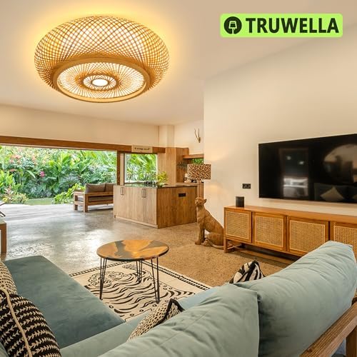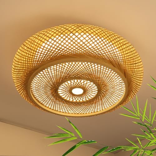 $159.99QGZXW 15.7″ Bamboo Woven LED Ceiling Light – Dimmable Boho Flush Mount with Remote