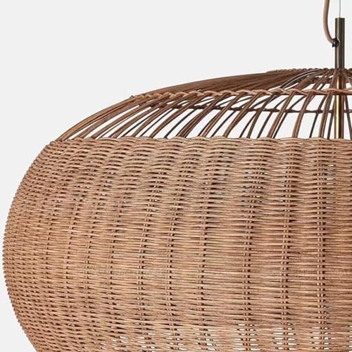 The open-weave bamboo wicker shade allows warm light to filter through, creating soft shadows and an inviting glow throughout the room. Whether installed above a kitchen island, dining table, or in a living room, this pendant light enhances the atmosphere with its cozy, organic aesthetic.